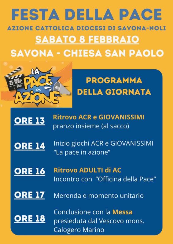 Savona. Sabato 8 febbraio nella Parrocchia San Paolo Apostolo, nella zona pastorale Oltreletimbro, l’Azione Cattolica Italiana della Diocesi di Savona-Noli organizzerà la “Festa della Pace”. Si comincerà alle ore 13 con il ritrovo dei ragazzi dell’ACR e dei giovanissimi per il pranzo al sacco. Alle 14 inizieranno i giochi sul tema “La pace in azione”.