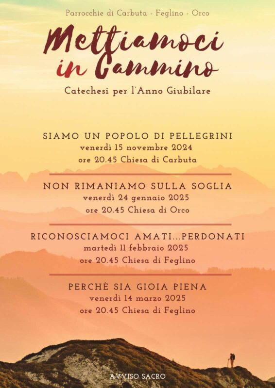 Si inizierà venerdì 15 novembre a Carbuta con il tema “Siamo un popolo di pellegrini”, si proseguirà venerdì 24 gennaio a Orco con la serata “Non rimaniamo sulla soglia” e martedì 11 febbraio a Feglino con “Riconosciamoci amati… perdonati” e si terminerà venerdì 14 marzo ancora a Feglino con l’incontro “Perché sia gioia piena”.