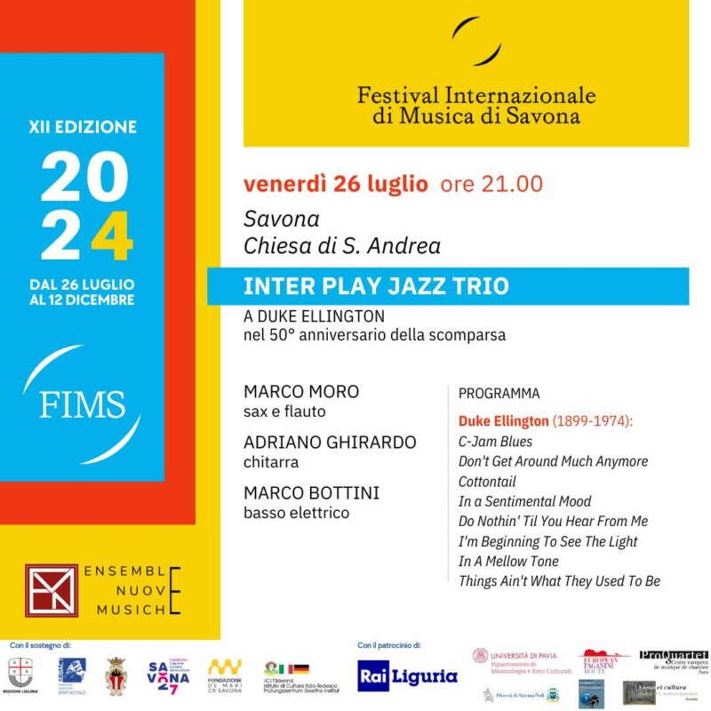 Venerdì 26 luglio alle ore 21 nella Chiesa Sant’Andrea Apostolo, in piazza dei Consoli, nel centro storico, il concerto “A Duke Ellington nel 50° anniversario della scomparsa” dell’Inter Play Jazz Trio aprirà il XII Festival Internazionale di Musica di Savona, promosso dall’associazione Ensemble Nuove Musiche in collaborazione con il Servizio per i Beni Culturali Ecclesiastici della Diocesi di Savona-Noli. Diciannove concerti di importante caratura internazionale si svolgeranno nelle cornici più suggestive del Savonese fino al 12 dicembre.