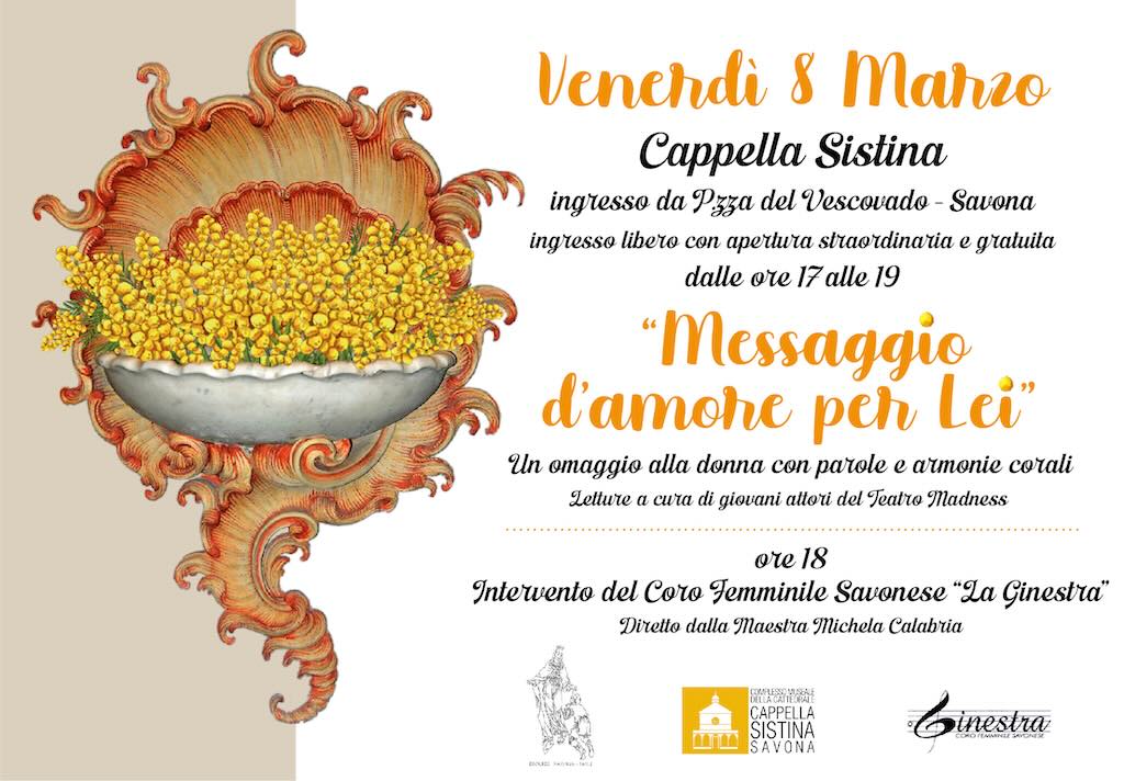Savona. In occasione della Giornata Internazionale della Donna venerdì 8 marzo la Cappella Sistina sarà eccezionalmente aperta al pubblico dalle ore 17 alle 19 ad ingresso libero. Sarà l’occasione per fruire di una visita al monumento identitario della città e proseguire il progetto museale “Messaggio d’amore per Lei” (fidanzate, mogli, figlie, sorelle, Maria Vergine), iniziato il 10 febbraio nella Cattedrale Nostra Signora Assunta, in vista delle feste di Nostra Signora della Colonna e di Nostra Signora di Misericordia, raffigurate nelle rispettive cappelle della chiesa madre diocesana.