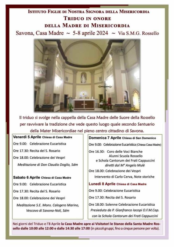 Dal 5 all’8 aprile dalle ore 10 a mezzogiorno e dalle 14:30 alle 17 per piccoli gruppi fino a 5 persone alla volta la Casa Madre aprirà ai visitatori le stanze di santa Maria Giuseppa Rossello. Il 5, 6 e 8 aprile nella chiesa della Casa Madre alle 9 sarà officiata la messa e alle 17:30 si reciterà il rosario. Il 5 e 6 aprile alle 18 si celebreranno i vespri: venerdì con una meditazione del biblista don Claudio Doglio, sabato con il vescovo Calogero Marino.