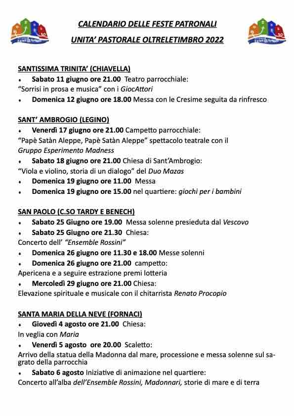 Sabato 25 giugno alle ore 19 il vescovo Calogero Marino presiederà la messa solenne e alle 21:30 in chiesa si terrà il concerto con brani classici a cura dell’Ensemble Rossini. Domenica 26 giugno alle 11:30 e alle 18 saranno officiate ancora le messe solenni e dalle 21 nel campo sportivo si terrà l’apericena e l’estrazione dei premi della lotteria. Mercoledì 29 giugno alle 21 in chiesa si potrà partecipare all’elevazione spirituale musicale con il chitarrista e compositore savonese Renato Procopio.
