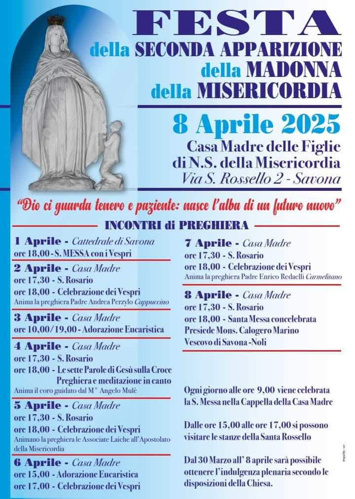 “In questo anno giubilare è per noi una grande gioia rinnovare l’invito a festeggiare solennemente la seconda apparizione di Maria, dopo le celebrazioni del 2024 per il 75esimo anniversario della canonizzazione di santa Rossello – dicono le Figlie di Nostra Signora di Misericordia – La chiesa ospita l’effigie di Maria Madre di Misericordia, dono del Comune di Savona al nostro istituto religioso. Dall’alto del presbiterio il Suo sguardo materno e le Sue braccia accoglienti attendono i fedeli che desiderano pregare ai Suoi piedi. Nell’occasione dell’apparizione la Madonna ci ha lasciato in eredità un messaggio che ricordiamo, oggi più che mai, con gratitudine e speranza: ‘Misericordia e non giustizia!'”.
