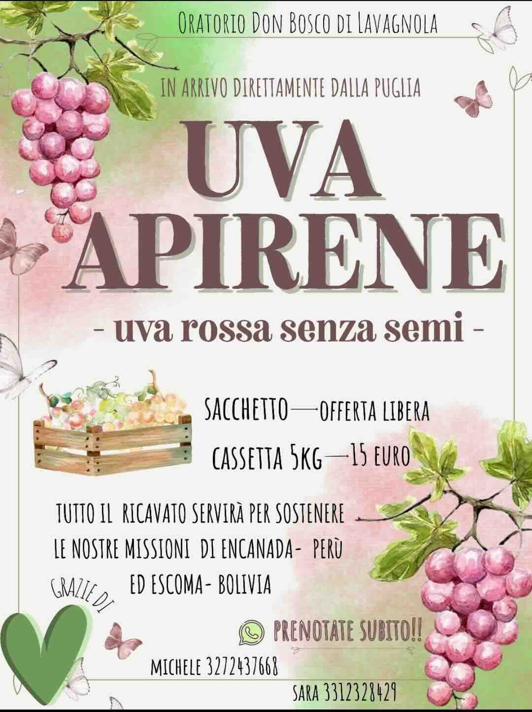 Savona. I ragazzi dell’Oratorio Don Bosco lanciano una nuova iniziativa solidale per sostenere le missioni di Encañada, in Perù, ed Escoma, in Bolivia. Presso la Parrocchia San Dalmazio Martire, nel quartiere Lavagnola, oppure con consegna a domicilio è possibile infatti acquistare uva apirena della Puglia, bianca o rossa e senza semi: 1 sacchetto ad offerta libera, 1 cassetta di 5 kg a 15 €.