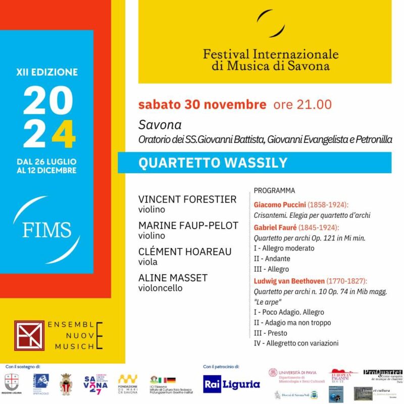 Ancora a Savona sabato 30 novembre alle ore 21 nell’Oratorio Santi Giovanni Battista, Giovanni Evangelista e Petronilla, in via Bartolomeo Guidobono, tornerà gradito ospite al Festival Internazionale di Musica di Savona il Quatuor Wassily, che già nella stagione 2022 si era esibito con grandissimo apprezzamento del pubblico per la sua qualità tecnica ed espressiva.