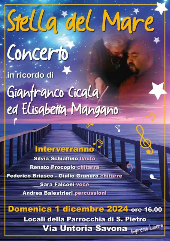 Domenica 1 dicembre alle ore 16 la Parrocchia San Pietro Apostolo, in via Untoria 6, ospiterà il concerto “Stella del Mare” in ricordo di Gianfranco Cicala ed Elisabetta Mangano. Si esibiranno Silvia Schiaffino al flauto, Renato Procopio, Federico Briasco e Giulio Granero alle chitarre, Sara Falconi alla voce e Andrea Balestrieri alle percussioni. L’ingresso sarà gratuito.