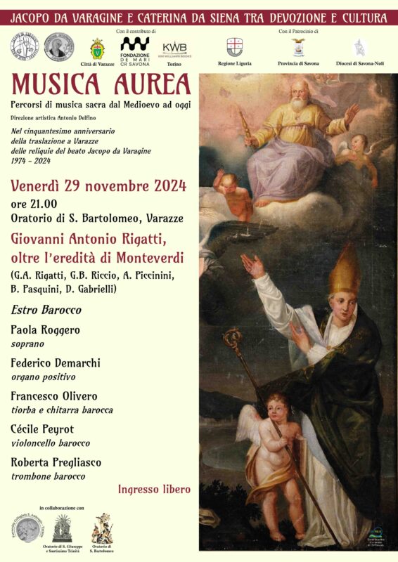 A Varazze venerdì 29 novembre alle ore 21 nell’Oratorio San Bartolomeo si terrà il concerto “Giovanni Antonio Rigatti, oltre l’eredità di Monteverdi” con musiche di Rigatti, Riccio, Piccinini, Pasquini e Gabrielli. Si esibirà il gruppo L’Estro Barocco, formato dal soprano Paola Roggero, Federico Demarchi all’organo positivo, Francesco Olivero a tiorba e chitarra barocca, Cécile Peyrot al violoncello barocco e Roberta Pregliasco al trombone barocco. L’evento è inserito nella rassegna “Musica aurea – Percorsi di musica sacra dal Medioevo ad oggi”, promossa dal Centro Studi Jacopo da Varagine con la direzione artistica di Antonio Delfino nel cinquantesimo anniversario della traslazione delle reliquie del beato Jacopo da Varagine (1974). L’ingresso sarà libero.