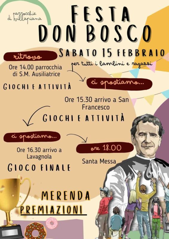 Savona. Sabato 15 febbraio le parrocchie di Villapiana organizzano la “Festa Don Bosco”. Si inizierà alle ore 14 con il ritrovo presso la Parrocchia Maria Ausiliatrice, in via san Giovanni Bosco, dove ci saranno con giochi e attività per tutti i bambini e ragazzi.