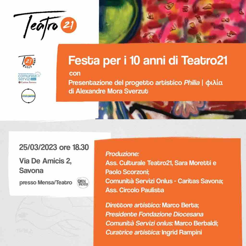 Savona. Sabato 25 marzo alle ore 18:30 nella mensa della Caritas, in via Edmondo De Amicis 2, l’associazione culturale Teatro21, che collabora proprio con Caritas e Fondazione Diocesana ComunitàServizi, festeggerà i suoi dieci anni presentando il progetto artistico “Philia” e inaugurando un murales del pittore brasiliano Alexandre Mora Sverzut. Lo scopo è rendere la mensa stessa uno spazio accogliente grazie all’arte intesa come forma di nutrimento dello spirito dell’uomo.