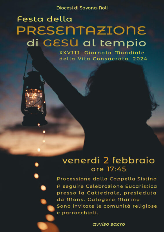 Savona. Venerdì 2 febbraio alle ore 17:45 nella Cattedrale Nostra Signora Assunta le congregazioni e gli ordini religiosi rinnoveranno la loro consacrazione per la lode di Dio e il bene di tutta la Chiesa durante la santa messa presieduta da monsignor Calogero Marino. La celebrazione si terrà in occasione della festa della Presentazione del Signore al Tempio, o “Candelora”, e della 28esima Giornata Mondiale della Vita Consacrata.