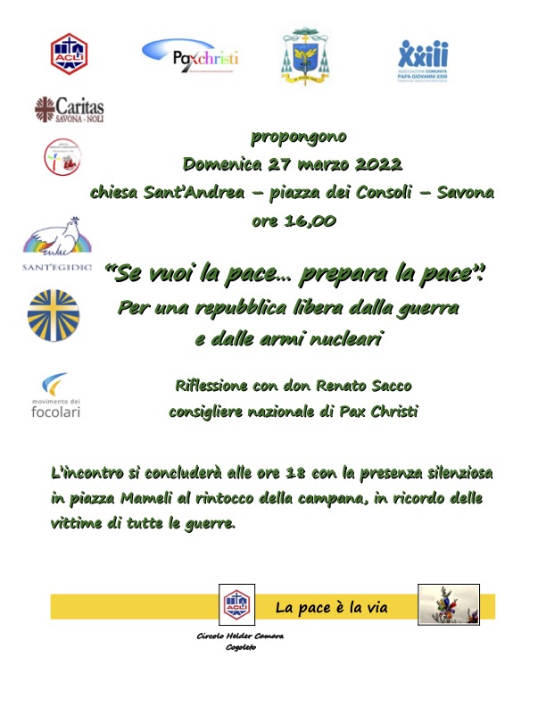 Savona. Domenica 27 marzo alle ore 16 nella Chiesa Sant’Andrea Apostolo, in piazza dei Consoli, nel centro storico, si terrà l’incontro “Se vuoi la pace… prepara la pace – Per una repubblica libera dalla guerra e dalle armi nucleari”.