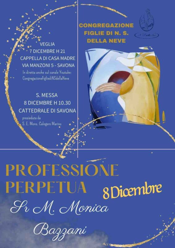 Savona. Giovedì 8 dicembre alle ore 10:30 nella Cattedrale Nostra Signora Assunta durante la messa pontificale per la solennità dell’Immacolata Concezione, presieduta dal vescovo Calogero Marino, suor Maria Monica Bazzani, Figlia di Nostra Signora della Neve, professerà i voti perpetui davanti a tutta la comunità ecclesiale. Il rito sarà preceduto da una veglia di preghiera in preparazione all’evento mercoledì 7 dicembre alle 21 nella cappella della Casa Madre, in via santa Maria Maggiore, e su YouTube.