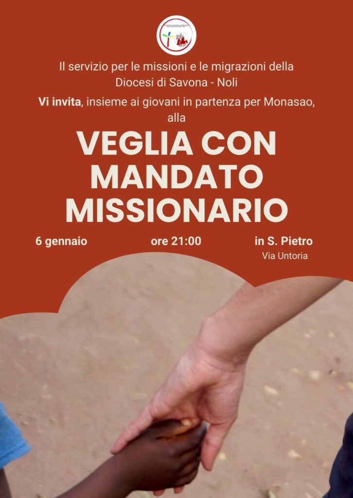 Savona. Martedì 6 gennaio alle ore 20:30 nella Chiesa San Pietro Apostolo, in via Untoria, il vescovo Calogero Marino presiederà la cerimonia del mandato missionario per i tre giovani della diocesi di Savona-Noli (due ragazze e un ragazzo) che tra gennaio e febbraio partiranno per un’esperienza di circa un mese a Monasao, nella Repubblica Centrafricana, dove opera il sacerdote diocesano don Michele Farina. La celebrazione si terrà alla presenza dei genitori, dei familiari e degli amici.