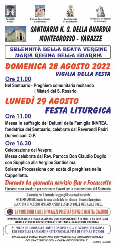 Varazze festeggia la Beata Vergine Maria Regina della Guardia. Domenica 28 agosto, vigilia della solennità liturgica, alle ore 21 al Santuario Nostra Signora della Guardia, sul monte Grosso, in prossimità della frazione Casanova, si terrà la preghiera comunitaria con la recita dei Misteri del santo rosario.