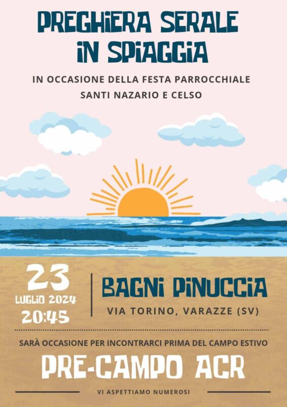 Varazze. Questa settimana la Parrocchia Santi Nazario e Celso, guidata da don Iosif Demeterca, festeggia i suoi compatroni. Si inizierà martedì 23 luglio alle ore 20:45 sulla spiaggia dei Bagni Pinuccia di via Torino con la preghiera in preparazione al campo estivo diocesano dell’Azione Cattolica Ragazzi.