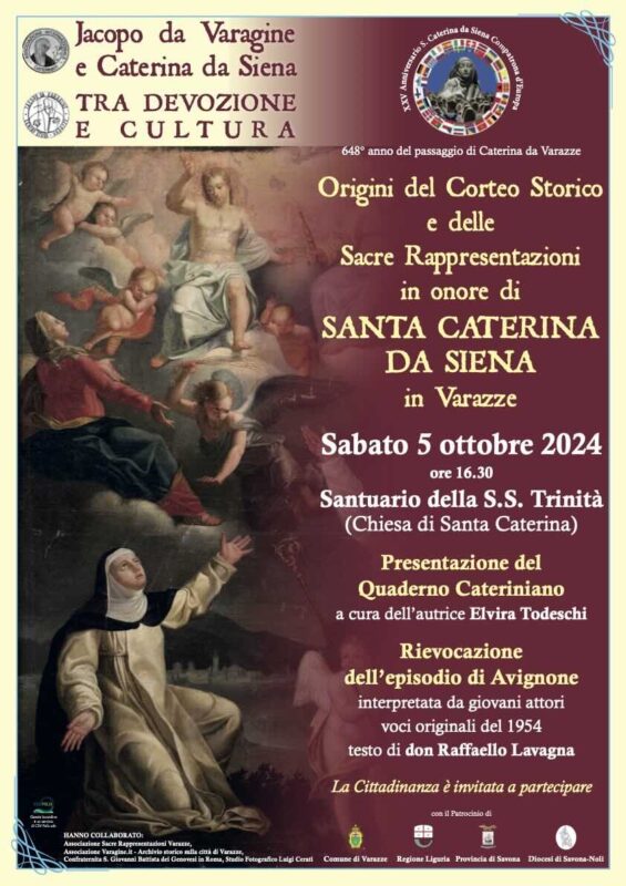 All’iniziativa collaborano l’Associazione Sacre Rappresentazioni e l’Associazione Varagine.it – Archivio Storico Fotografico della Città di Varazze. L’evento è inserito nel progetto “Jacopo da Varagine e Caterina da Siena tra devozione e cultura”, elaborato con il Centro Studi Jacopo da Varagine e il patrocinio della Diocesi di Savona-Noli, del Comune, della Provincia di Savona e della Regione Liguria.