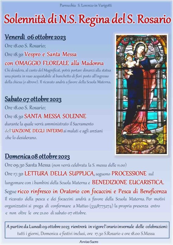 Per motivi organizzativi si prega di confermare a Matteo (cellulare: 3348775274) la propria presenza al rinfresco entro e non oltre le 21 del 7 ottobre. Da lunedì 9 ottobre tornerà in vigore l’orario invernale delle celebrazioni: tutti i giorni, domenica e festivi inclusi, alle 17:30 il rosario e alle 18 la messa. Per ulteriori informazioni è possibile contattare la parrocchia.