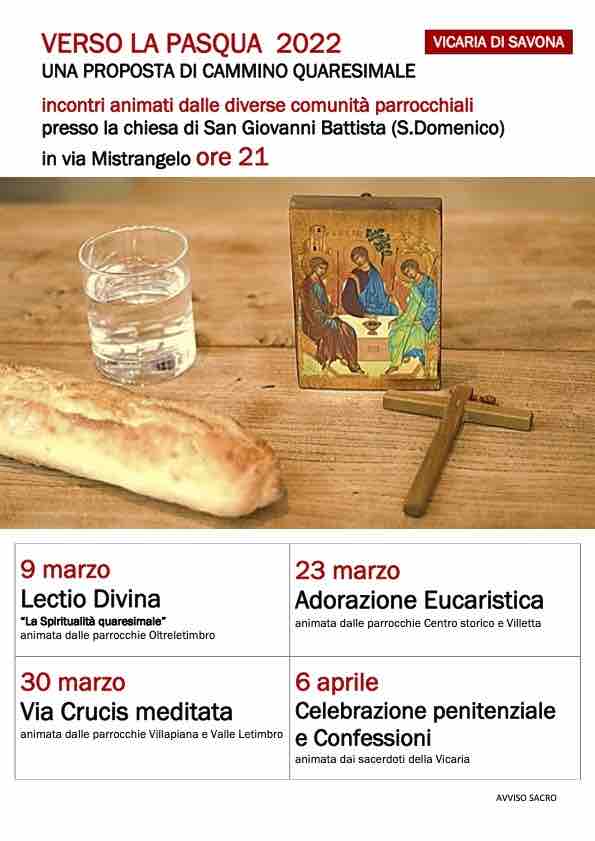 Continua il cammino “Verso la Pasqua 2022”, la serie di incontri animati dalle comunità parrocchiali della Vicaria di Savona per questo periodo di Quaresima. Mercoledì 30 marzo alle ore 21 nella Chiesa San Giovanni Battista in San Domenico, in via Alfonso Mistrangelo, si terrà la Via Crucis meditata con le parrocchie di Villapiana e della valle del Letimbro.