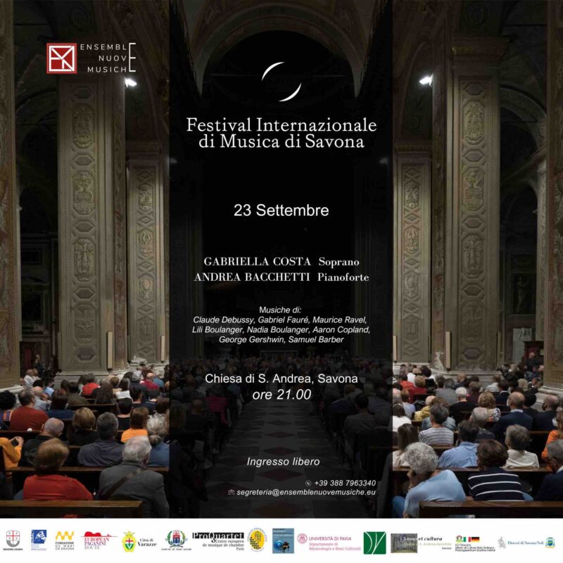 Nel contesto dell’undicesima edizione del Festival Internazionale di Musica di Savona, organizzato da Ensemble Nuove Musiche, e ancora di “Museo e Musica 2023” sabato 23 settembre alle ore 21 nella Chiesa Sant’Andrea Apostolo il soprano Gabriella Costa e il pianista Andrea Bacchetti si esibiranno in un concerto dedicato alla musica francese e americana del Novecento storico, un periodo in cui le due culture ebbero significativi contatti (Ravel e Gershwin, Nadia Boulanger con Copland e Bernstein).